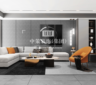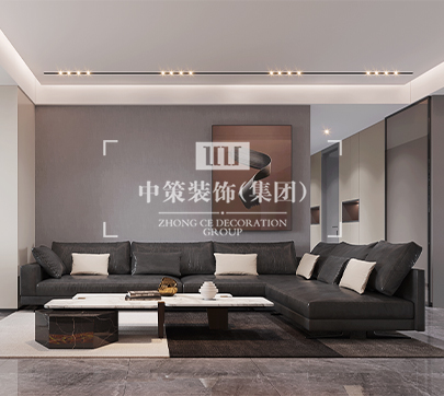 客厅以黑白灰为基调,绀蓝色为点缀。从玄关到客厅延续了全屋色系的统一性,沉稳有力的客厅设计成为整个房间的视觉中心。