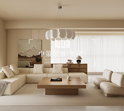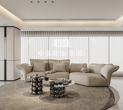 本案的客厅极简顶面辅以干练的线条与优雅的石膏线呈现,简约而有层次感。光线透过窗纱照射到客厅,地毯上几何图案的颜色刚好和家具匹配,给整个空间带来一份安详与洁净。