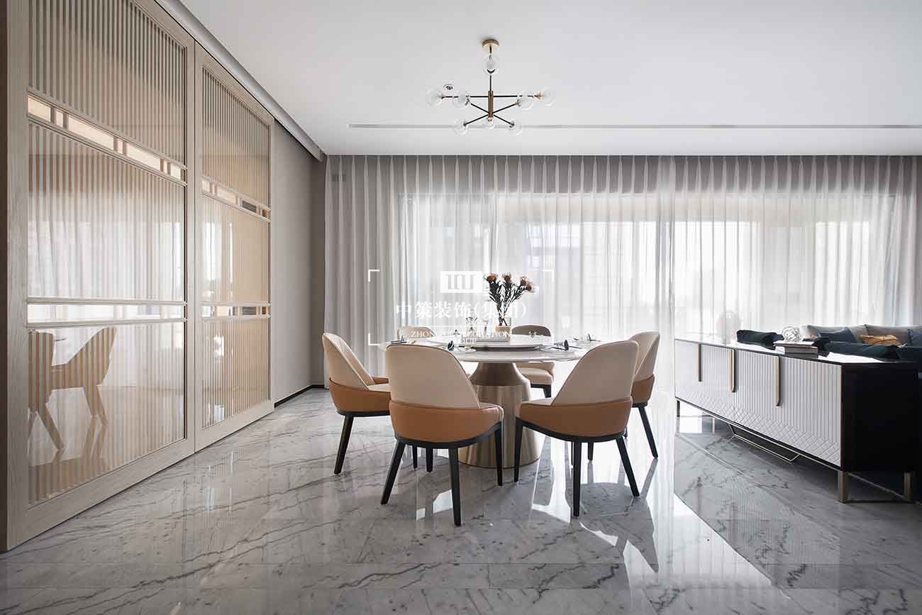 餐桌整体造型简约而略带装饰,天然的大理石桌面简洁大气,圆桌的设计为业主一家营造其乐融融的家庭氛围。