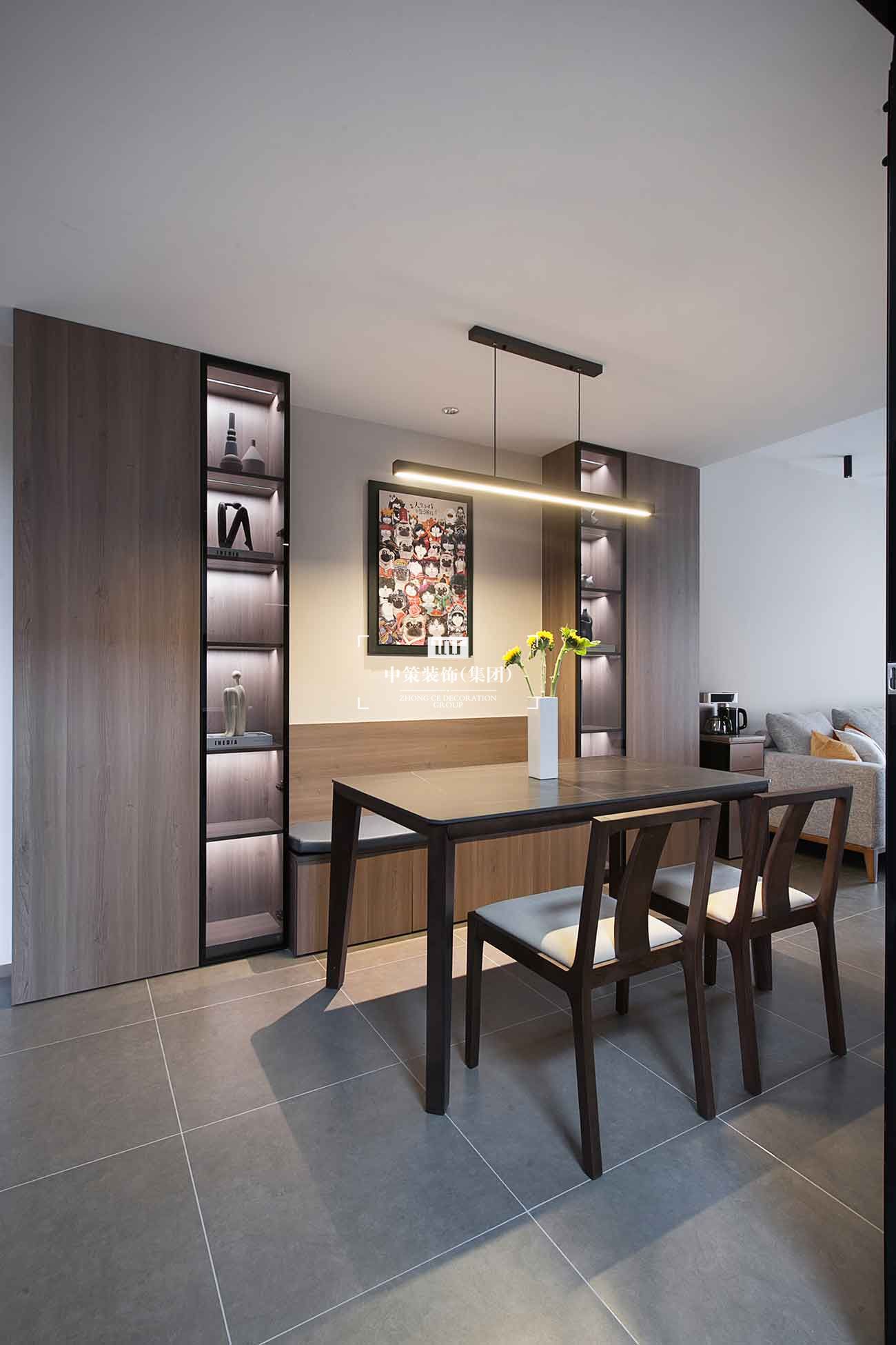 ①拆除多余墙体,餐厅采用卡座的方式解决餐厅狭窄的问题,改变过道狭长的视觉感及利用问题。