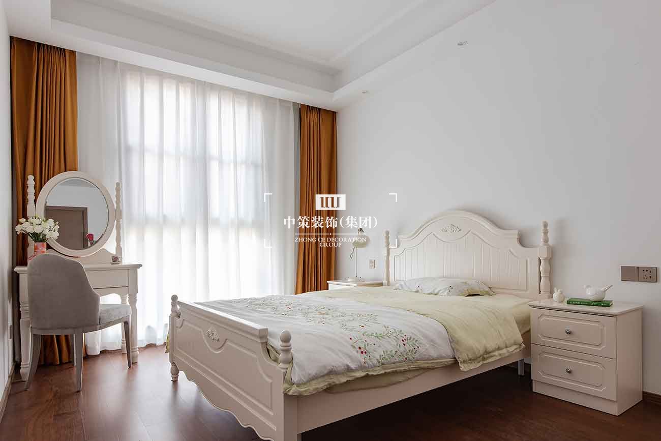 ②卧室背景墙配色大胆,不拘泥条条框框,成全空间个性化设计。柔美的线条、温暖的色彩,无不体现着简约法式中的浪漫、优雅、温馨而富有艺术感的格调。