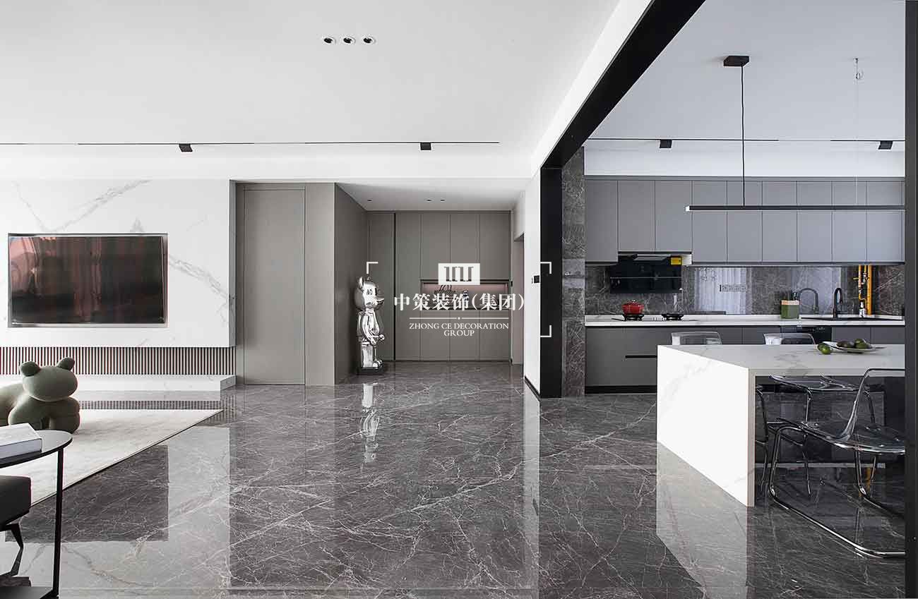 客厅主要表现出来的是沉稳,以石材和木饰面为主要材料,氛围安静和谐,更加能带动人的情绪,整个空间摒弃了传统主灯,采用了围绕灯带的设计来营造整体氛围。从墙体到地面黑、白、灰的现代质感,让人的心,不由自主就沉浸下去。