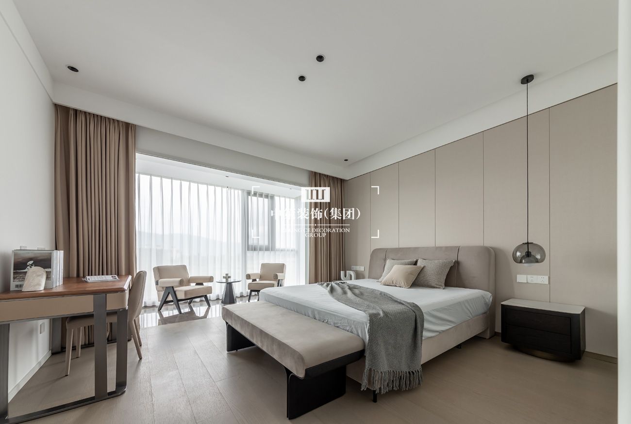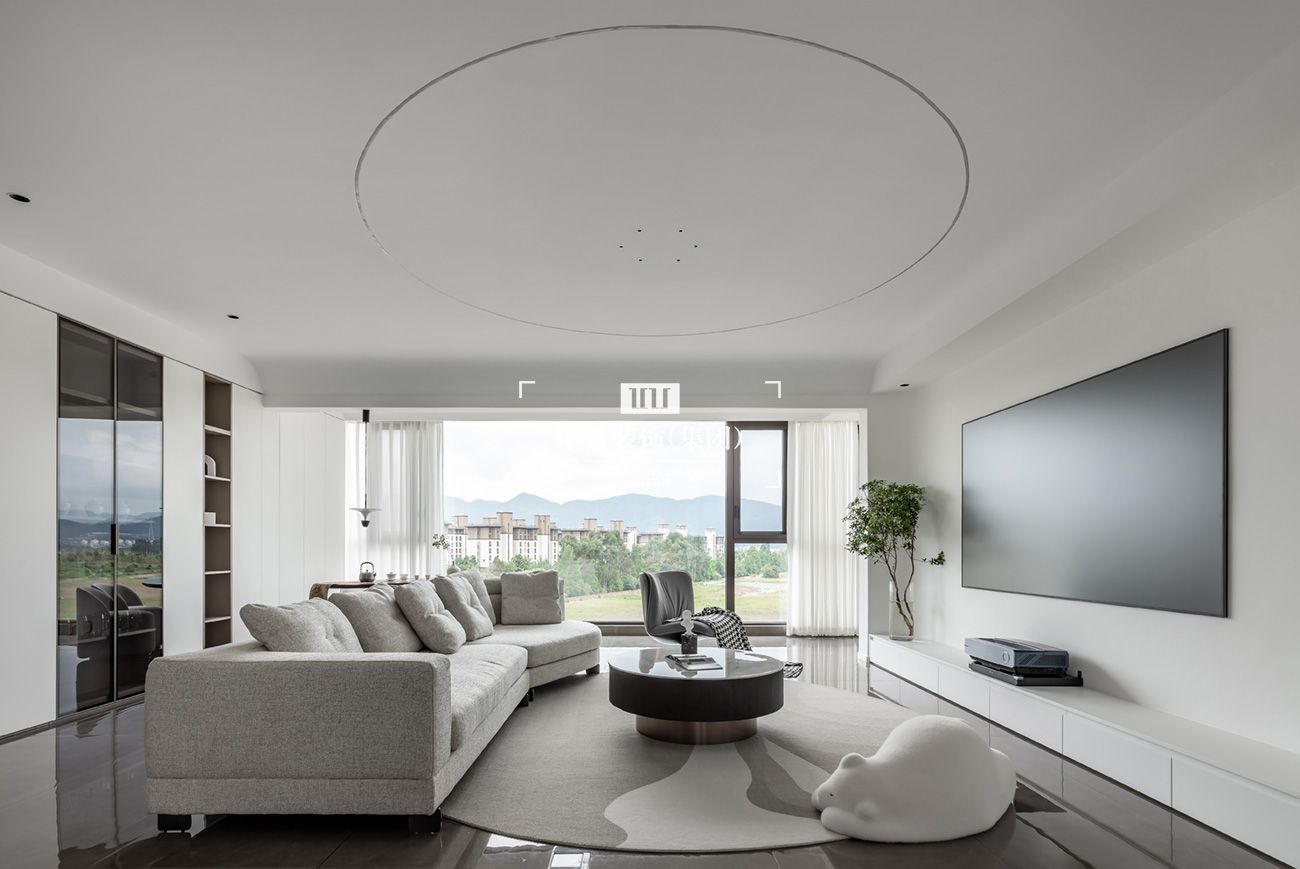 ②客厅:客厅外扩至阳台,引入室外景色,增加茶室功能实现人景合一,大面积墙面留白增加呼吸感,电视背景与餐厅阳台墙面阴角做弧形处理延伸空间视觉,顶面用大圆形线性灯,定制柜体做弧形圆角处理,搭配软装后高级感由然而生。