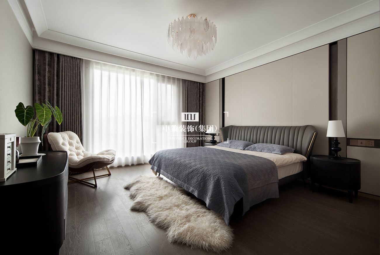 ②二楼主卧:皮质与墙布美妙融合,营造出满溢温馨的氛围。床尾斗柜与床头柜选用黑色手抓纹木质,为空间增添无尽舒适之感。窗帘之上的暗花花纹,恰似整个房间的神来之笔,令整个空间更显奢华大气。