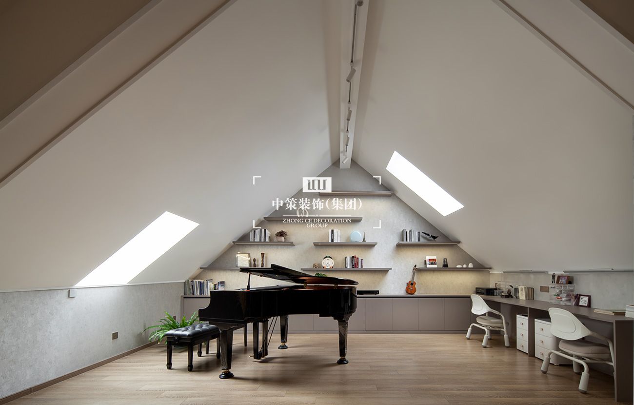 ①三楼:顶楼呈斜尖之状,大梁林立。设计之时,将那光线黯淡之处精心打造成储物间以及小朋友们的神秘基地。而光线充沛之所,则摇身一变,成为小型音乐厅、书房与会客区域。姐姐轻抚钢琴,妹妹拉动小提琴,一场别开生面的小型音乐会便在此处缓缓拉开帷幕。