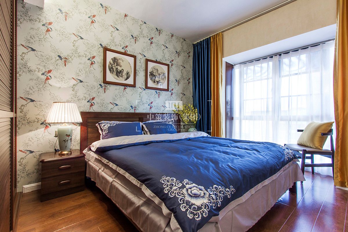 在本案的设计中抽象提取东方元素,整体家具色调选用较为质朴的胡桃木色为主,配以沉稳优雅,又具有低调、唯美意象的钴蓝色和充满希望的明黄色调的窗帘及明黄色的跳舞兰花艺;墙面配以欢快愉悦的花鸟纹墙纸饰面;打破沉闷,满足业主温馨和愉悦的居家需求;更为空间注入温润质感的沉着调性,书写深邃的东方传统情怀。