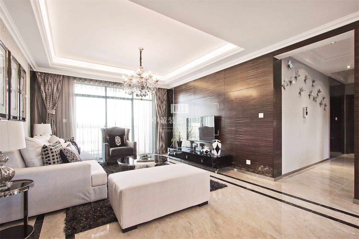 这是一个灵动的空间,客厅落地窗外美妙的阳光,透过纱帘若隐若现,阳光明媚的日子,与落地窗内的情景浪漫的邂逅了,米色的沙发,复古的水晶吊灯,钢架烤漆茶几上纤尘不染,纯粹的整洁与光融合的恰到好处,抱枕上素雅的几何图案打破了整体的单调,让整个客厅多了几分生动与高贵。