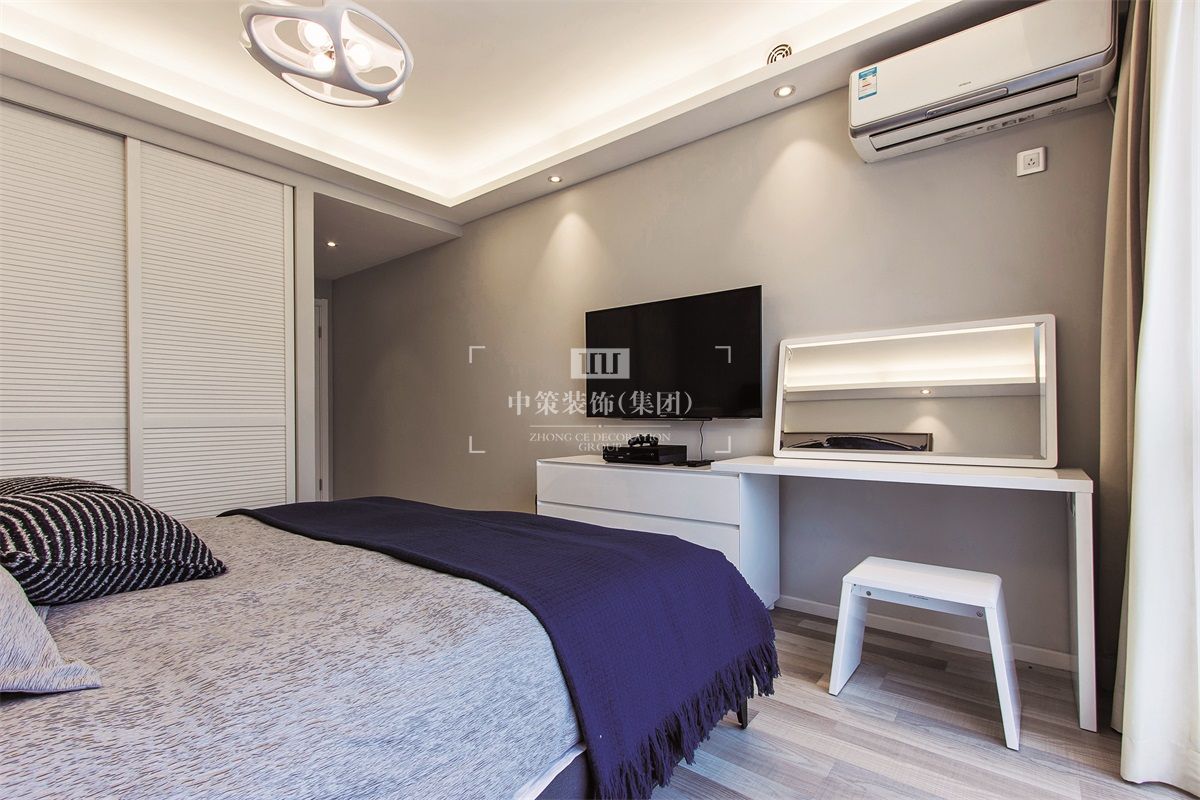 现代简约强调的是从务实出发,讲究的是美观与实用同在。卧室也遵循了这一要求,两间都以浅灰色作为基础色调,配上了深蓝色和深棕色作为对比,突出两个房间不同的精神格调。一间更为年轻和律动,一间更为沉稳而祥和。值得一提的是床头的装饰画,很好的搭配了空间的颜色,同时也为房间增添了生动的画面感。
